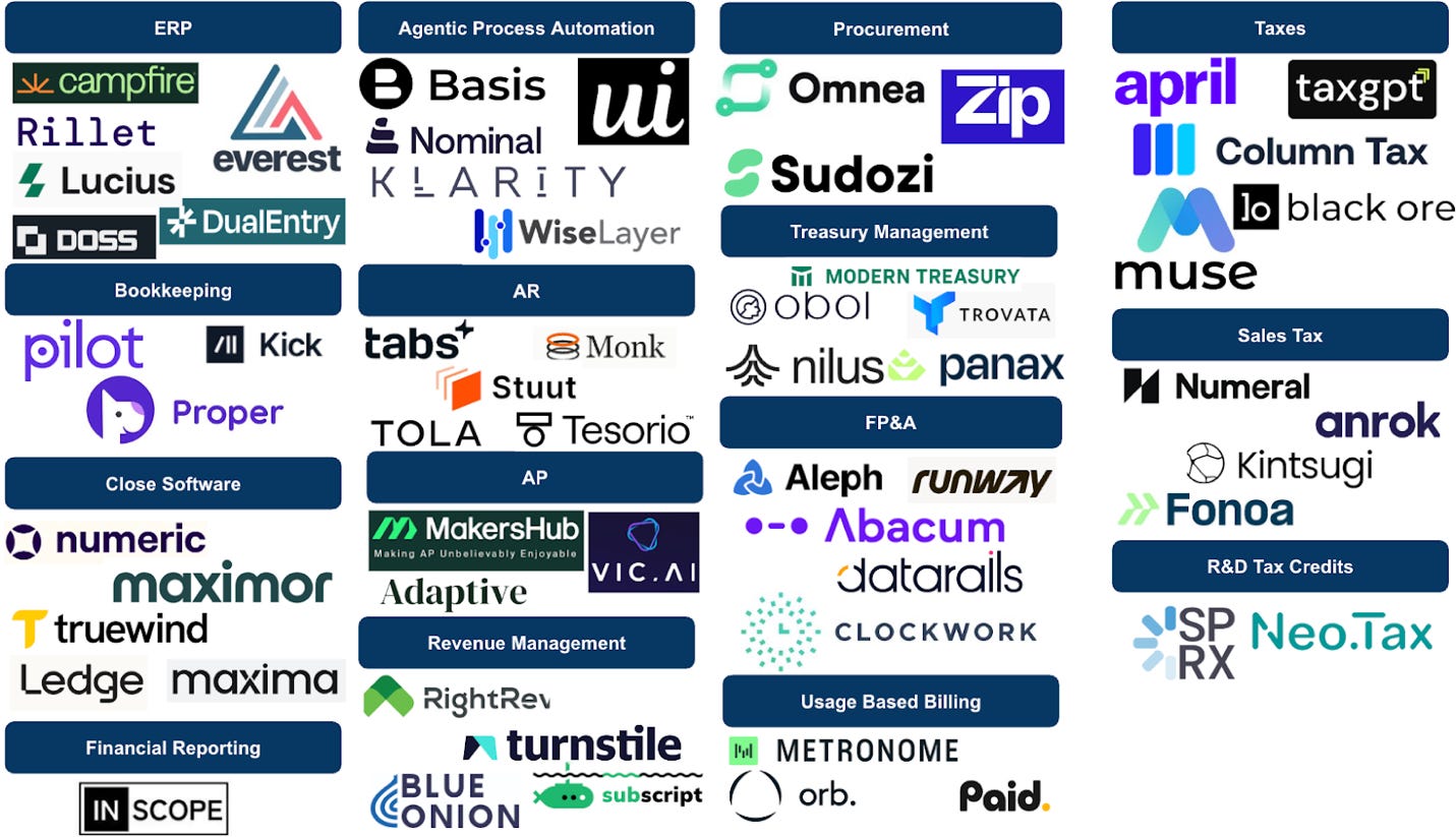 - Capital flowing into the stack: Investor conviction is strong and is accelerating the category’s momentum. Recent financings include Rillet ($70 million Series B from a16z and ICONIQ; $30 million from Sequoia), Campfire ($35 million Series A from Accel), Dual Entry ($90 million from Lightspeed, Khosla Ventures and Google Ventures) and Tabs ($55 million Series B from Lightspeed and GC).